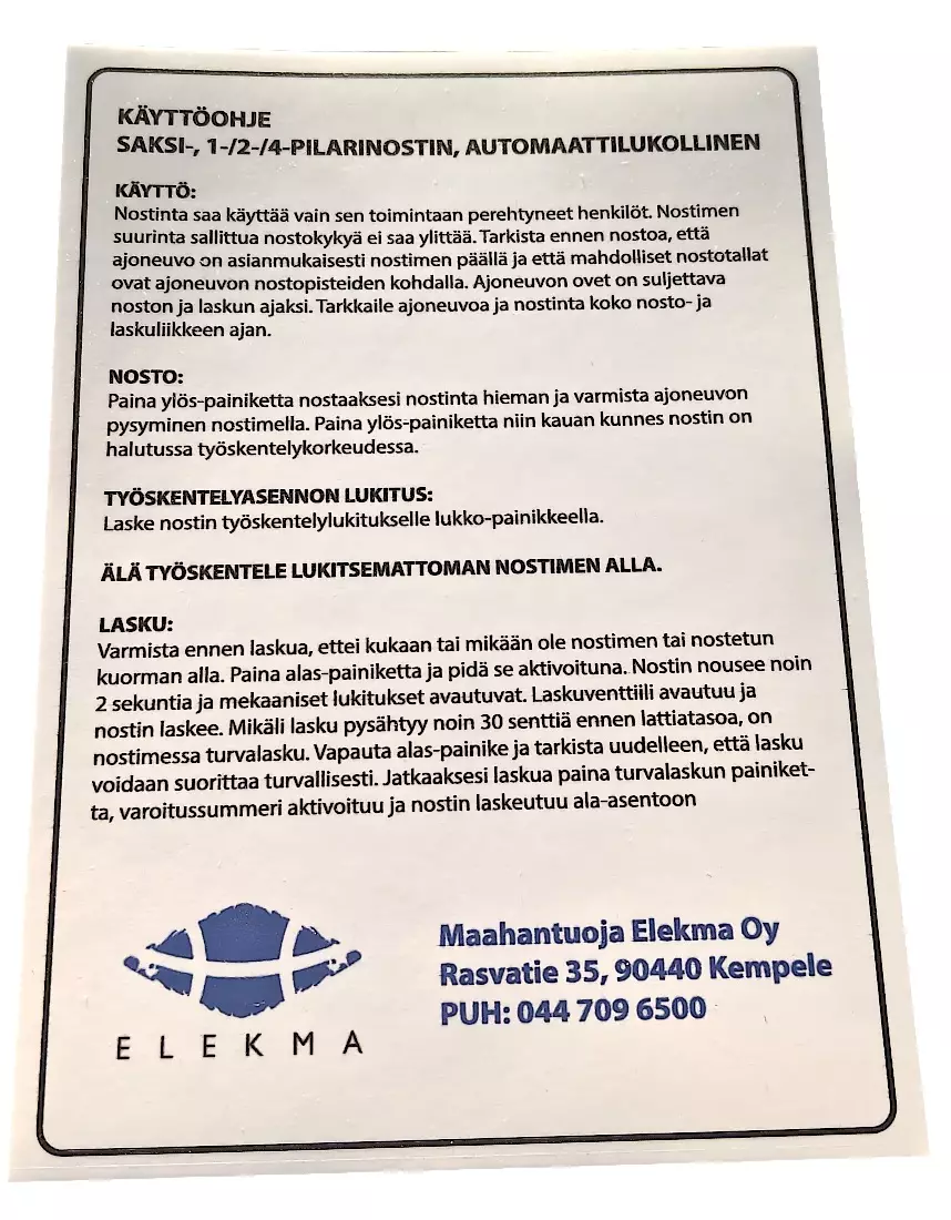Kestävä ja laadukas käyttöohjetarra automaattilukollisille 1-pilari, 2-pilari, 4-pilari sekä saksinostimille. Suunniteltu vaativiin olosuhteisiin.Tarran päällä on UV-säteilyä kestävä suojakalvo, joka takaa pitkäaikaisen suojaavuuden. Erittäin säänkestävä – kestää kosteutta, haalistumista ja kulutusta. Täydellinen valinta pitkäikäiseen ja luotettavaan merkintään! Tarkista, että ohjeen kuvaus vastaa nostimesi toimintaa.