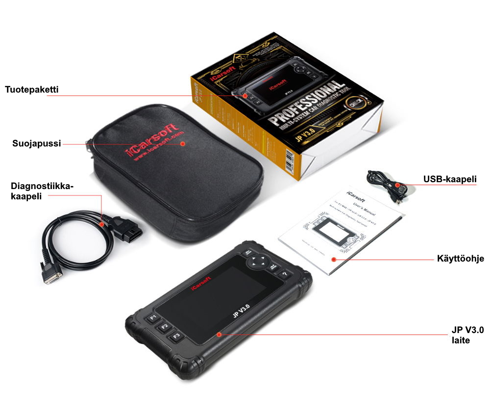 - Sisältää suomenkielisen käyttöohjeen ja suomenkielisen OBD2 vikakoodiluettelon yleisille moottorin vikakoodeille (P0-alkuiset vikakoodit)