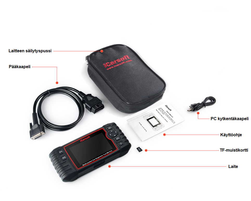 - Sisältää suomenkielisen käyttöohjeen ja suomenkielisen OBD2 vikakoodiluettelon yleisille moottorin vikakoodeille (P0-alkuiset vikakoodit)