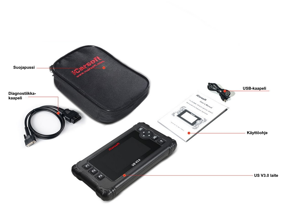 - Sisältää suomenkielisen käyttöohjeen ja suomenkielisen OBD2 vikakoodiluettelon yleisille moottorin vikakoodeille (P0-alkuiset vikakoodit)